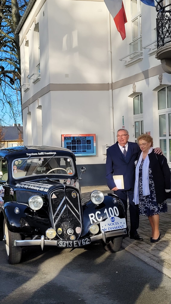 L’heure de la retraite sonne en 2001 pour Laurent, mais la mécanique reste son quotidien. Quand il ne travaille pas sur sa traction, il conseille ou assiste un coreligionnaire, et l’on ne compte plus les tractions sur lesquelles il est intervenu, par un réglage, l’usinage d’une pièce, la réfection d’une pompe à eau. L’horizon s’élargit aussi pour la 11 légère, bien au delà de sa promenade calaisienne quasi quotidienne, les menant, entre autres, jusqu’au sud du Portugal (où Laurent put méditer sur le sort réservé à son saint patron, raconté en azulejos), autour des lacs italiens et tout récemment en Autriche, sans compter les participations (ou organisations) régionales ou nationales, d’où un vaste cercle d’amis. 1966-2026, 60 années se sont écoulées. Quatre petits-enfants et trois arrière-petits-enfants ont agrandi la famille, et Marie France et Laurent ont souhaité repasser devant Monsieur le Maire pour célébrer cette longue union. Olivier Planque a été ravi de présider cette sympathique cérémonie, en présence de la famille, des nombreux amis, des représentants de la Traction Universelle et du Tacot Club Calaisien.