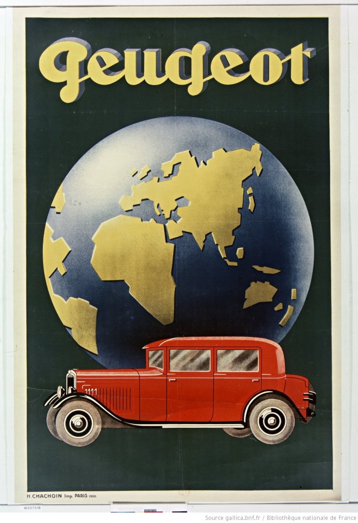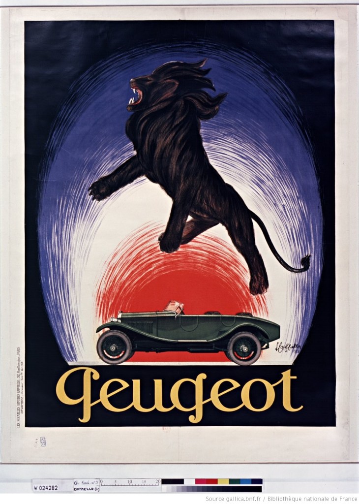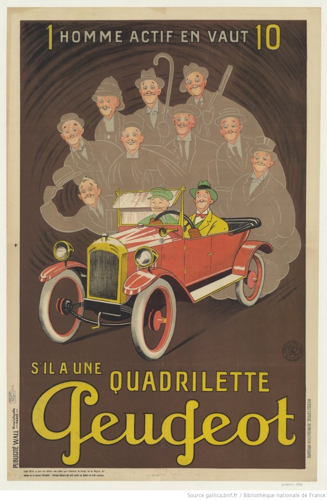 La deuxième série est consacrée aux automobiles Peugeot. La 1ère vante la Quadrilette et date de 1925 et a été éditée par les Publicités Wall, la seconde date aussi de 1925 et la troisième de 1930 : elles sont toutes deux l’oeuvre de Leonetto Cappiello (peintre, illustrateur, caricaturiste et affichiste italien qui oeuvra pour d’autres marques telles la Ouate Thermogène ou le papier à cigarettes Nil et bien d’autres), la quatrième met en valeur la 201 et date de 1931.