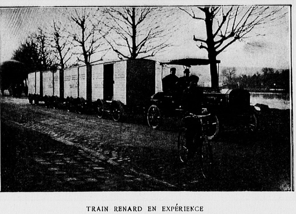 Les chemins de fer exigent d’abord la pose des rails, ce qui constitue une dépense énorme. En outre, une fois la voie construite, les trains ne pourront jamais s’en écarter et une erreur commise dans le tracé viendra compromettre parfois l’avenir de l’exploitation, tandis qu’avec les trains Renard on n’a pas à établir de ligne avant de les mettre en circulation. Les frais de premier établissement se bornent à l’édification de quelques ateliers, remises ou bureaux, et à l’acquisition du matériel roulant.
