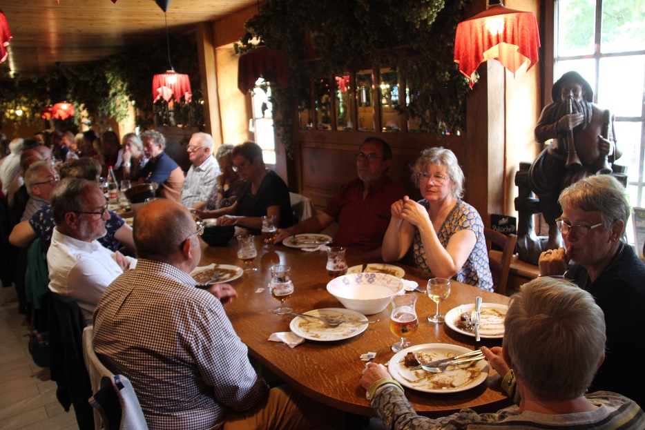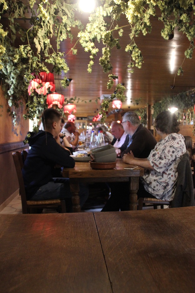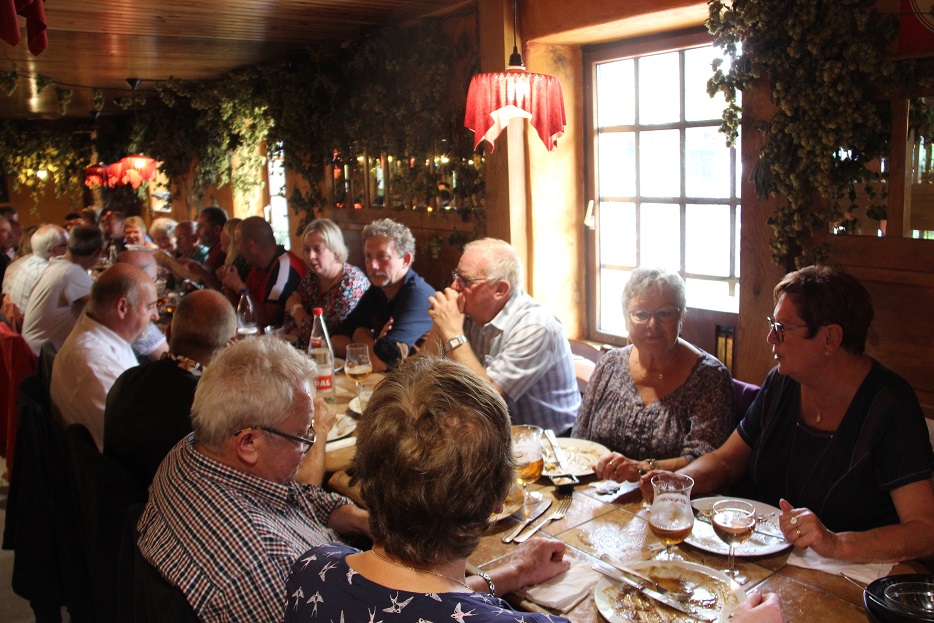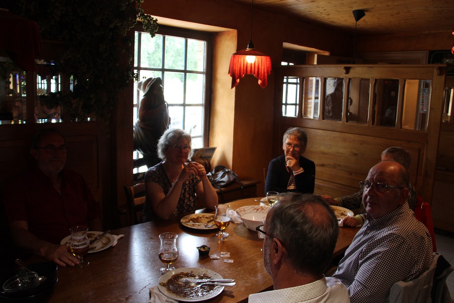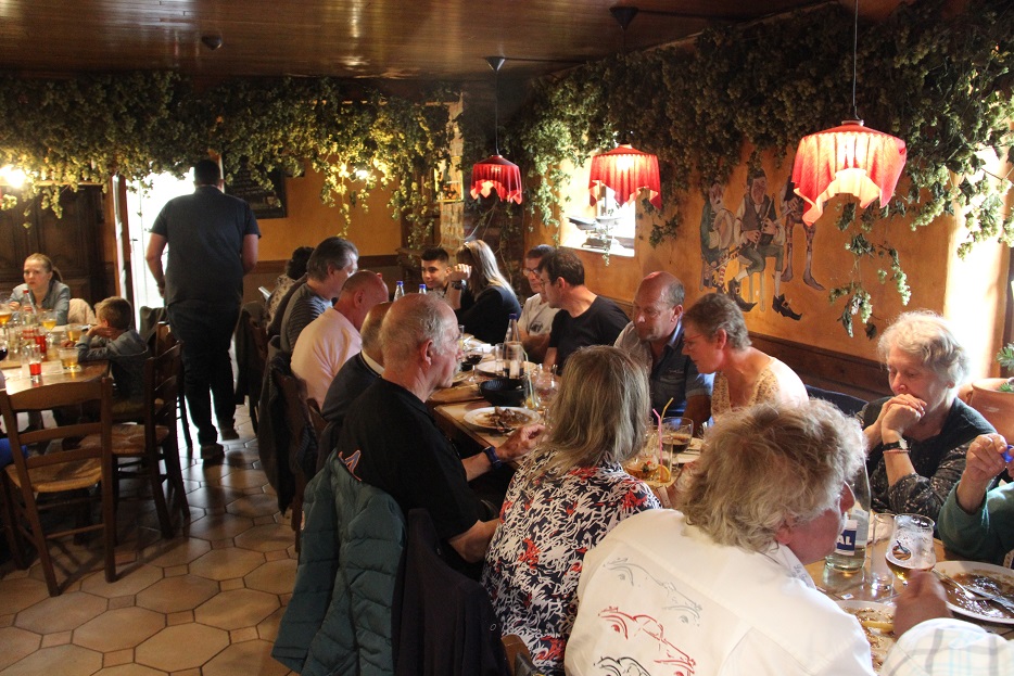 Après cette visite il était temps de reprendre la voiture et de trouver le restaurant qui nous attendait : le Kauwackers et tout le monde, après un apéritif bien mérité, fit bonne chère avec une carbonnade flamande et ses frites avec ce qu’il fallait de bière. Nous avons eu la surprise de découvrir de la vigne plantée à côté de notre restaurant et peut-être un jour mangerons-nous notre carbonnade avec un crû local…