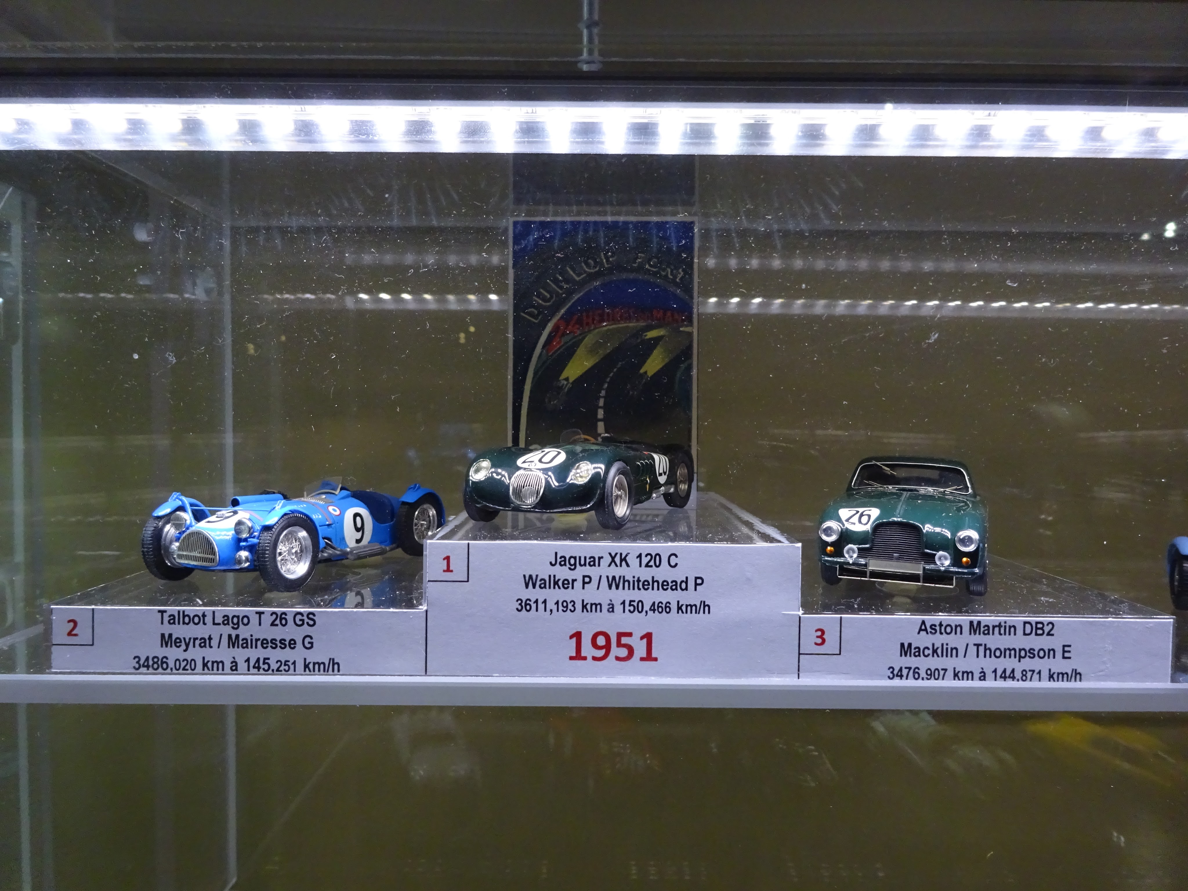 Une allée rend mémoire à de grandes figures, les fondateurs Durand et Faroux, les pilotes Benoist, Mme Siko, Pescarolo, les stars comme Steve Mc Queen. Elle débouche sur une vaste salle circulaire (plus de 20 m de diamètre) cernée d’une cinquantaine de vitrines : près de 4500 miniatures 1/43 des voitures alignées au départ, année par année !