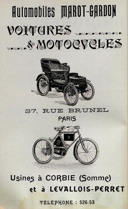 - Marot-Gardon (Etablissements), Société anonyme, à Paris, rue Brunel, 37 : Motocycles. Voitures automobiles. Usines à Corbie (Somme) et à Levallois-Perret, passage Expert, 3. Automobiles et motocycles.