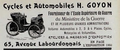 - Legros (René), à Fécamp, place de l’Hôtel-de-Ville, 11 : Deux voitures électriques à deux et quatre places. Deux moteurs électriques pour la traction. Deux voiturettes à pétrole. Deux motocycles. Divers appareils. Pièces détachées pour voitures. Usine électrique de Fécamp.