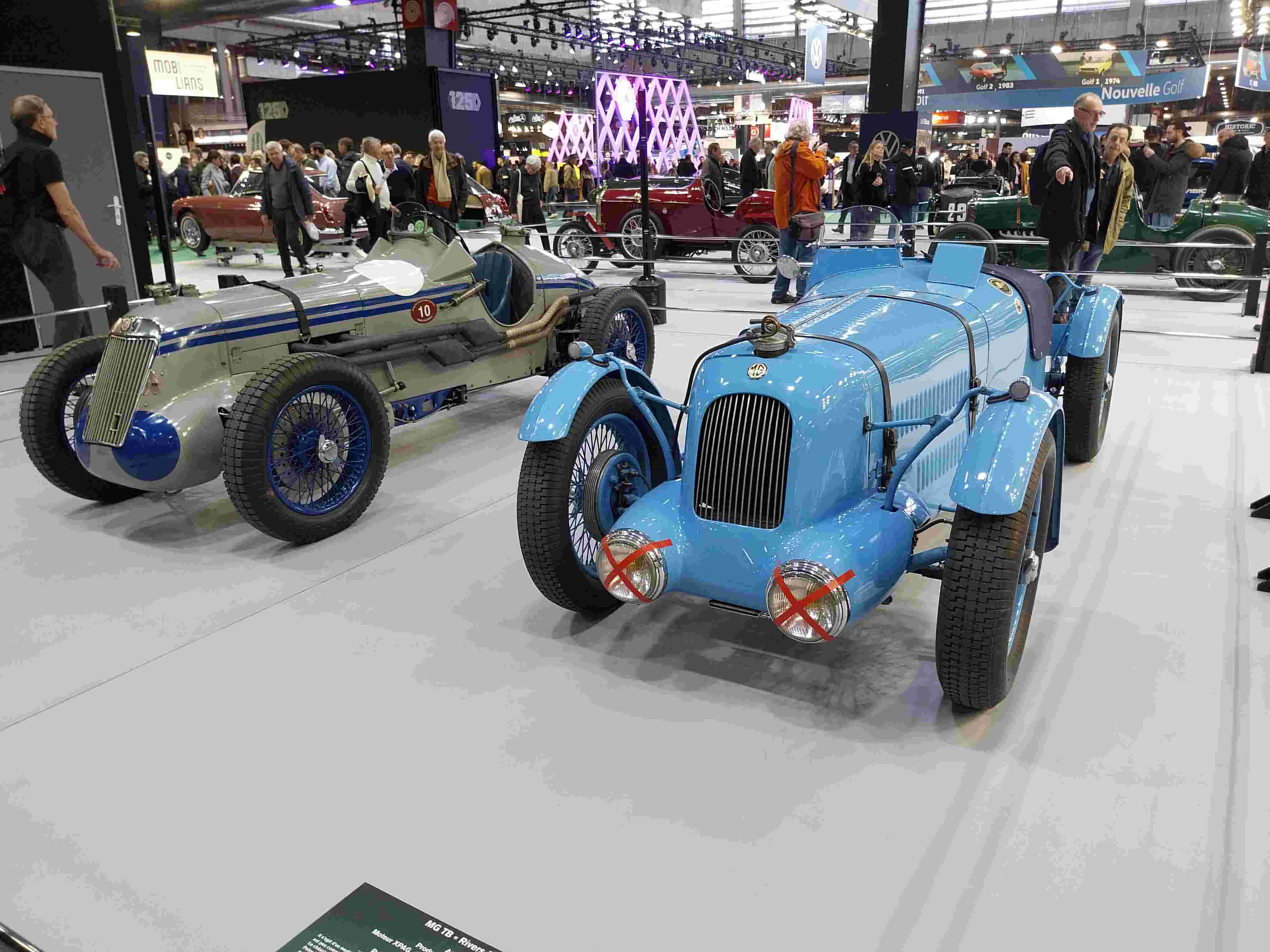 La grise est une MG type R, 4 cylindres, 746 cm3, compresseur Shorrock de 1935. La bleue est une MG TB baptisée « Rivers Fletcher » de 1939 et c’est un exemplaire unique.
