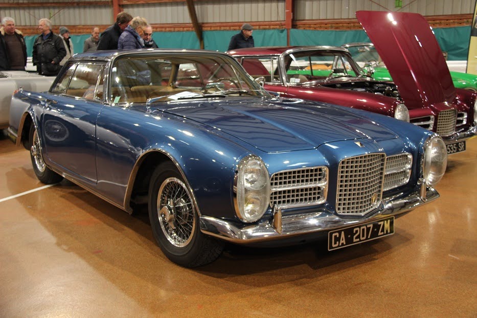 exemplaires sur 184 produits), à son époque le coupé 4 places le plus rapide du monde (240 km/h) avec des surfaces vitrées incroyables et un tableau de bord -en tôle peinte imitation bois- digne d’un avion de ligne.D’aucuns y voient la plus belle voiture française de l’après-guerre. Deux «petites » Facel 4 cylindres complétaient cette évocation, un cabriolet