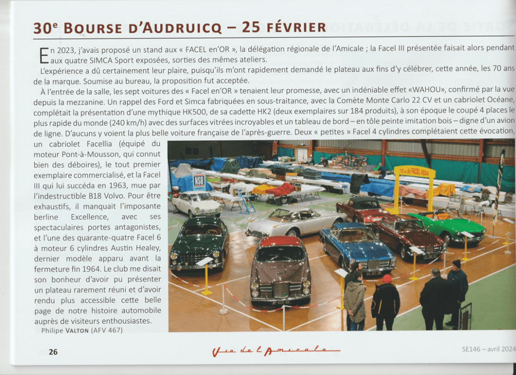 L’Amicale Facel Véga publie un bulletin trimestriel qui a réservé une page complète à l’exposition de notre Bourse.