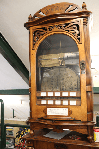 - les instruments de musique mécanique : ce sont essentiellement des boîtes à musique, des juke-box, un piano Steinway, une collection de près d’un millier de chopes à bière en faïence et munies chacune d’une petite boîte à musique dans le socle (certaines parfois avec le même décor mais avec une musique différente)…