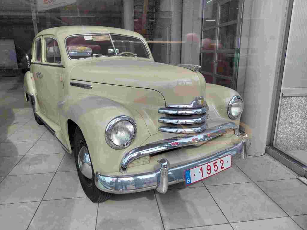 Pas très loin de la maison, à la recherche d’une huile qu’on ne trouve pas en France, j’arrive à un carrefour à Harelbeke et j’aperçois dans une vitrine de garage trois voitures anciennes.
